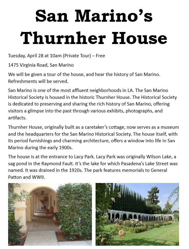 We have two offerings for your viewing pleasure this month, but it may be a bit more challenging to access, bear with us. Check GlendaleParksAtHome.com for the Plants of Deukmejian talk, and check eaglerockhistory.org for the Historic Transportation talk and live panel. We will update as we get more info. Both look very interesting and both are not under our control, so we hope all who want to attend will be able to "zoom-in".